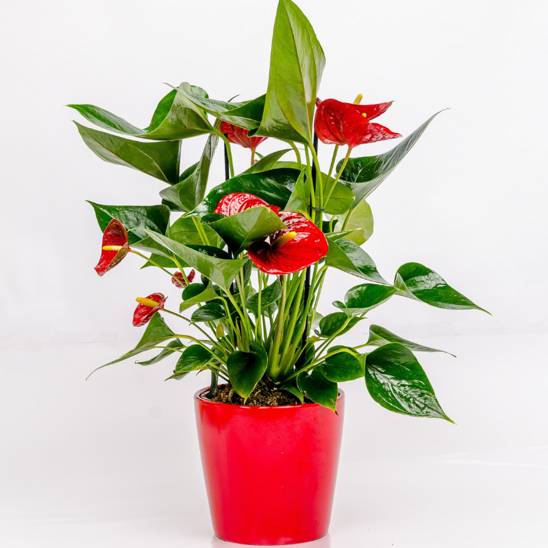 האנטוריום, עציץ בית ירוק בעל פריחה אדומה. צמח עמיד לאורך זמן רב ואם מטפלים בו נכון הפריחה שלו תישאר לזמן ארוך מאוד.